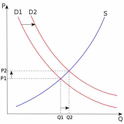 The price P of a product is determined by a balance between production at each price (supply S) and the desires of those with purchasing power at each price (demand D). The diagram shows a positive shift in demand from D1 to D2, resulting in an increase in price (P) and quantity sold (Q) of the product.