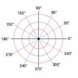 A set of polar coordinates. Note the polar angle increases as you go counterclockwise around the circle with 0 degrees pointing horizontally to the right.