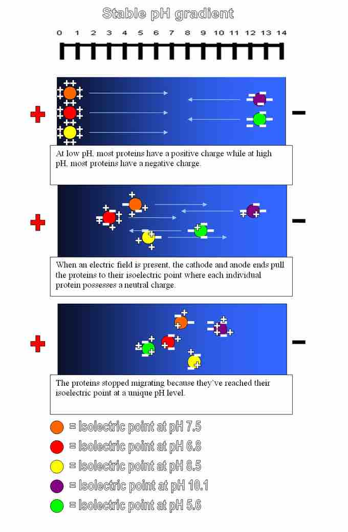 For example, a protein that is in a pH region below its isoelectric point will be positively charged and so will migrate towards the cathode (negative charge). As it migrates through a gradient of increasing pH, however, the protein's overall charge will decrease until the protein reaches the pH region that corresponds to its pI. At this point, it has no net charge, and so it stops moving in the gel. The proteins become focused into sharp stationary bands with each protein positioned at a point in the pH gradient corresponding to its pI. This technique is capable of extremely high resolution and can separate proteins that differ by as little as a single charge.