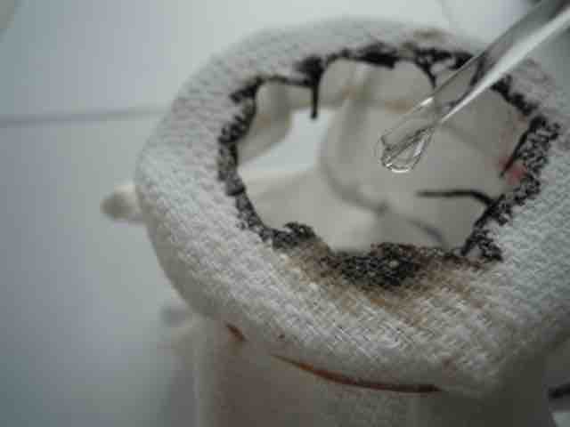 Drops of the concentrated oxoacid sulfuric acid (sulphuric acid) rapidly dehydrate a piece of cotton towel.