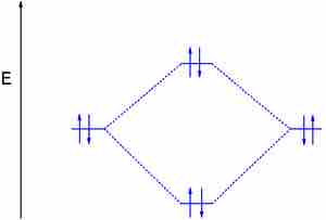This MO diagram depicts the molecule H2, with the contributing AOs on the outside sandwiching the MO. The bonding level (lower level) is completely occupied. A bond order of one is obtained by employing the formula above, indicating a stable bond.