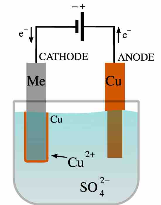 Two copper electrodes are placed in a solution of blue copper sulfate and are connected to a source of electrical current. The current is turned on for a period of time.
