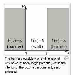 Energy and position relationships of the particle in a box. Inside the box the potential V(x) is zero. Outside the box the potential energy is infinite.