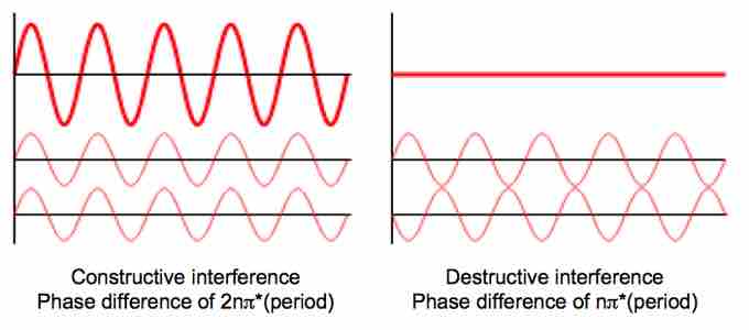 These two examples represent constructive (left) and destructive interference (right) in wave phenomena. When the two waves are "in phase," their periods are offset by 2nπ*period. However, when they are precisely out of phase, destructive interference results if the phase difference is nπ*period.