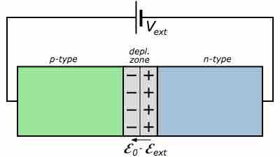 If the battery anode is connected to the p-type semiconductor and the cathode connected to the n-type semiconductor, the system is said to be reverse biased and negligible current passes.
