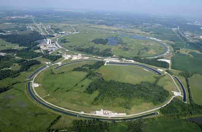 Aerial photo of the Tevatron at Fermilab, which resembles a figure eight. The main accelerator is the ring above; the one below (about half the diameter, despite appearances) is for preliminary acceleration, beam cooling and storage, etc.