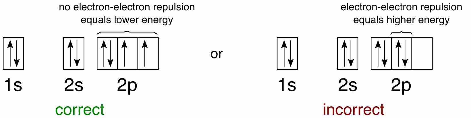According to the first rule, electrons will always occupy an empty orbital before they pair up. Electrons are negatively charged and, as a result, they repel each other. Electrons tend to minimize repulsion by occupying their own orbital, rather than sharing an orbital with another electron. Further, quantum-mechanical calculations have shown that the electrons in singly occupied orbitals are less effectively screened or shielded from the nucleus.