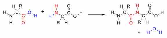 The condensation (dehydration) of two amino acids to form a peptide bond (red) with expulsion of water (blue).
