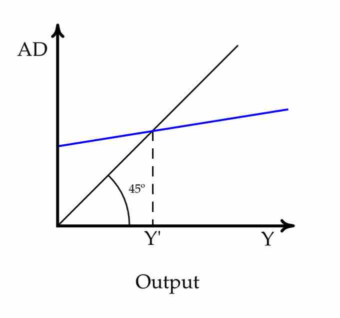 In this graph, equilibrium is reached when the total demand (AD) equals the total amount of output (Y). The equilibrium point is where the blue line intersects with the black line.