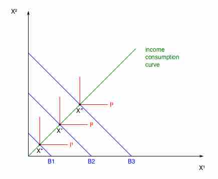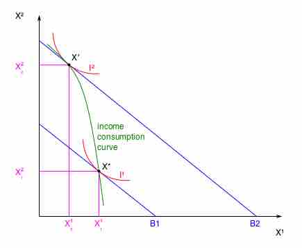 The simplest way to demonstrate the effects of income on overall consumer choice, from the viewpoint of Consumer Theory, is via an income-consumption curve for a normal good(see ). The basic premise behind this curve is that the varying income levels (as illustrated by the green income line curving upwards) will determine different quantities and balanced baskets along the provided indifference curves for the two goods being compared in this graph. These differences in quantity reflect the increase or decrease an a given individual's purchasing power, thus the income effect could be summarized as the increase in relative utility captured by a consumer with more monetary power.