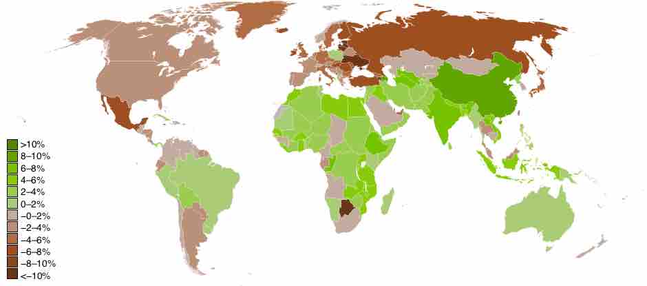 Modern markets are dependent upon one another across national borders, where global trends in economic growth and well-being will have a dramatic impact on national economic well-being and vice versa. As a result, the 2007-2009 economic collapse had large effects not only at the origin (in the United States), but also on a global scale. The speed in which the market decline spread across the globe underlines just how far globalization and international interdependence has come, with GDP growth numbers in 2009 already demonstrating substantial losses across the map (see ).