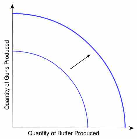 An increase in technology that allows for greater output based upon the same inputs can be described as an outward shift of the PPF, as demonstrated in this figure.