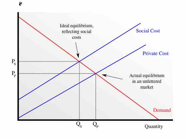 Graphically, negative externalities occur when social costs are lower than private costs, and firms produce more units than is socially optimal. The ideal equilibrium quantity that reflects negative externalities is Qs, but firms may produce at Qp.