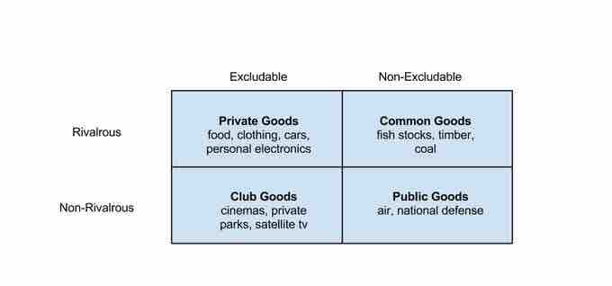 There are four categories of goods in economics, based on whether the goods are excludable and/or rivalrous in consumption.