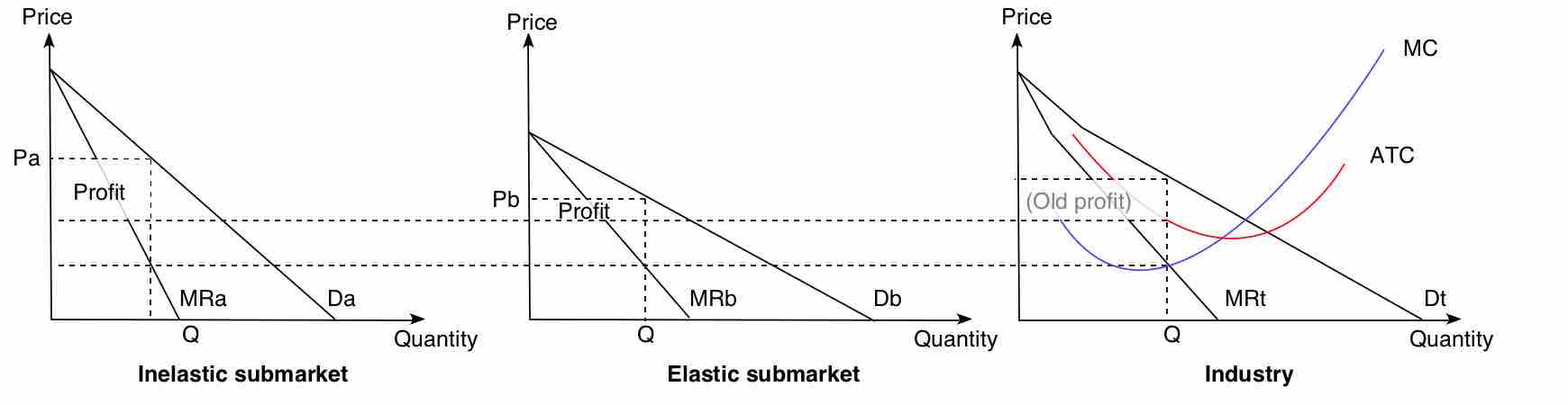 These graphs show multiple market price discrimination. Instead of supplying one price and taking the profit (labelled "(old profit)"), the total market is broken down into two sub-markets, and these are priced separately to maximize profit. The graph shows how a seller wants to generate the most revenue possible for a good or service. The elasticity of a market influences the profit.