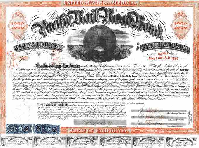 $1,000 (30 year, 7%) "Pacific Railroad Bond" (#93 of 200) issued by the City and County of San Francisco.