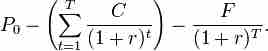 Where: P is the price paid for the bond with warrants; C is the coupon payment; T is the maturity of the bond; r is the required rate of return; and F is the face value of the bond.