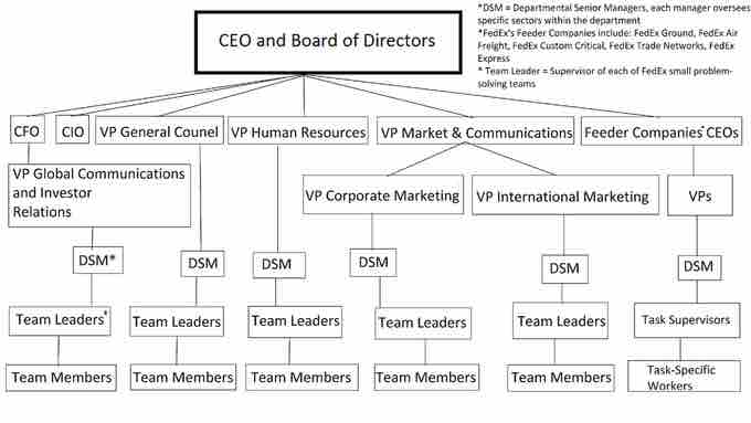This organizational chart shows a broad functional structure at FedEx. Each different functions (e.g., HR, finance, marketing) is managed from the top down via functional heads (the CFO, the CIO, various VPs, etc.).