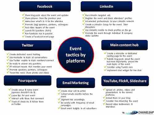 This graphic lists possible uses for social media sites when putting on a business marketing event.