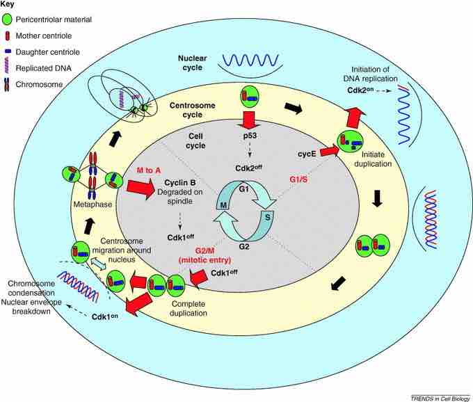 Centrosomes are associated with the nuclear membrane during prophase of the cell cycle. In mitosis the nuclear membrane breaks down and the centrosome nucleated microtubules (parts of the cytoskeleton) can interact with the chromosomes to build the mitotic spindle . The mother centriole, the one that was inherited from the mother cell, also has a central role in making cilia and flagella. The centrosome is copied only once per cell cycle so that each daughter cell inherits one centrosome, containing two structures called centrioles.