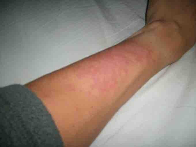 This rash seen on a forearm is a typical reaction observed when an antibiotic causes phototoxicity.