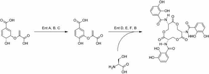 Enterobactin (also known as Enterochelin) is a high affinity siderophore that acquires iron for microbial systems. It is primarily found in Gram-negative bacteria, such as Escherichia coli and Salmonella typhimurium.