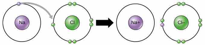 This movement of electrons from one element to another is referred to as electron transfer. As illustrated, sodium (Na) only has one electron in its outer electron shell. It takes less energy for sodium to donate that one electron than it does to accept seven more electrons to fill the outer shell . When sodium loses an electron, it will have 11 protons, 11 neutrons, and only 10 electrons. This leaves it with an overall charge of +1 since there are now more protons than electrons. It is now referred to as a sodium ion. Chlorine (Cl) in its lowest energy state (called the ground state) has seven electrons in its outer shell. Again, it is more energy efficient for chlorine to gain one electron than to lose seven. Therefore, it tends to gain an electron to create an ion with 17 protons, 17 neutrons, and 18 electrons. This gives it a net charge of -1 since there are now more electrons than protons. It is now referred to as a chloride ion. In this example, sodium will donate its one electron to empty its shell, and chlorine will accept that electron to fill its shell. Both ions now satisfy the octet rule and have complete outer shells. These transactions can normally only take place simultaneously; in order for a sodium atom to lose an electron, it must be in the presence of a suitable recipient like a chlorine atom.