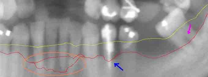 This section from a panoramic x-ray film depicts the teeth of the lower left quadrant, exhibiting generalized severe bone loss of 30–80%. The red line depicts the existing bone level, and the yellow line depicts where the gingiva was originally (1–2 mm above the bone), prior to the patient developing periodontal disease. The pink arrow, on the right, points to a furcation involvement, or the loss of enough bone to reveal the location at which the individual roots of a molar begin to branch from the single root trunk; this is a sign of advanced periodontal disease.