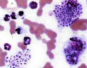 Cytologic preparation from a case of feline sporotrichosis; phagocytic cells show numerous variably-shaped yeast forms within.
