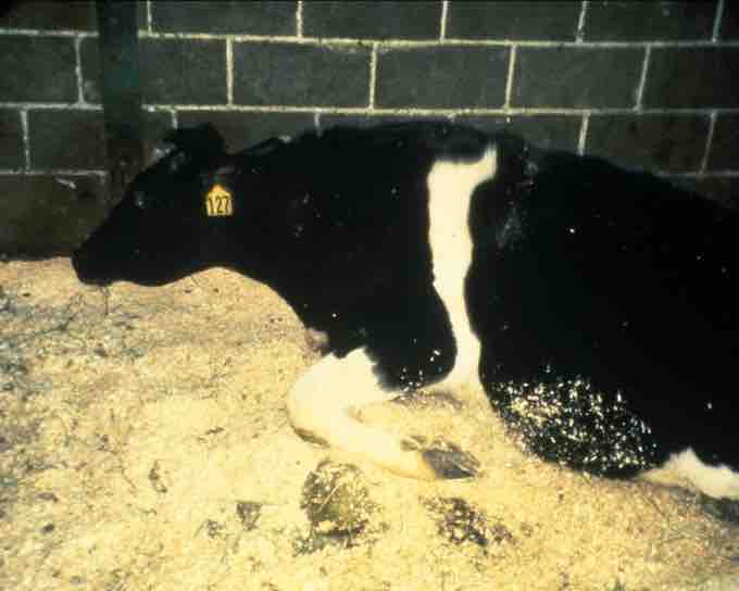 A cow suffering from BSE. The disease has progressed so far the animal cannot stand.