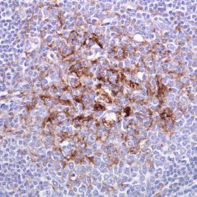 The brown staining is for the prion protein responsible for variant Creutzfeldt–Jakob disease prion.