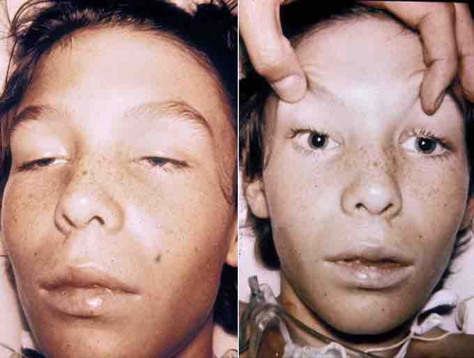 A 14-year-old with botulism. Note the bilateral total ophthalmoplegia with ptosis in the left image and the dilated, fixed pupils in the right image. This child was fully conscious.