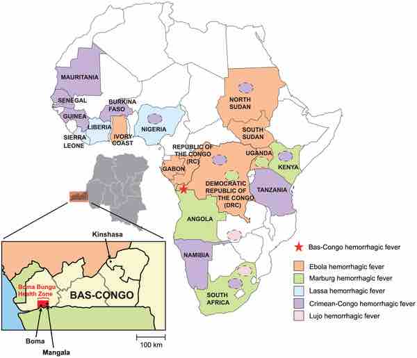 Indeed the advent of deep sequencing technologies and other methods are identifying emergent viral hemorrhagic fevers. A recent study using deep sequencing, discovered a novel rhabdovirus (Bas-Congo virus, or BASV) associated with a 2009 outbreak of three human cases of acute hemorrhagic fever in Mangala village, Democratic Republic of Congo (DRC), Africa. The cases, presenting over a three-week period, were characterized by abrupt disease onset, high fever, bloody vomiting, and diarrhea, and, in two patients, death within three days. BASV was present in the blood of the lone survivor at a concentration of over a million copies per milliliter. The genome of BASV, assembled from over 140 million sequence reads, reveals that it is very different from any other rhabdovirus. The lone survivor and a nurse caring for him (with no symptoms), both health care workers, were found to have high levels of antibodies to BASV, indicating that they both had been infected by the virus. Although the source of the virus remains unclear, the study findings suggest that BASV may be spread by human-to-human contact and is an emerging pathogen associated with acute hemorrhagic fever in Africa .