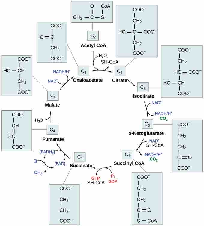 Like the conversion of pyruvate to acetyl CoA, the citric acid cycle takes place in the matrix of the mitochondria. Almost all of the enzymes of the citric acid cycle are soluble, with the single exception of the enzyme succinate dehydrogenase, which is embedded in the inner membrane of the mitochondrion. Unlike glycolysis, the citric acid cycle is a closed loop: the last part of the pathway regenerates the compound used in the first step. The eight steps of the cycle are a series of redox, dehydration, hydration, and decarboxylation reactions that produce two carbon dioxide molecules, one GTP/ATP, and reduced forms of NADH and FADH2 . This is considered an aerobic pathway because the NADH and FADH2 produced must transfer their electrons to the next pathway in the system, which will use oxygen. If this transfer does not occur, the oxidation steps of the citric acid cycle also do not occur. Note that the citric acid cycle produces very little ATP directly and does not directly consume oxygen.