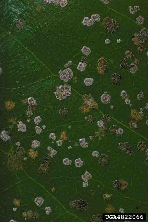Infestation of the algal leaf spot (Cephaleuros virescens) on ther southern magnolia (Magnolia grandiflora); Green-orange algal spots or "green scruf" on leaf surface. The grayish-white and darker "crusts" are lichens of the genus Strigula resulting from fungal colonization of the alga.