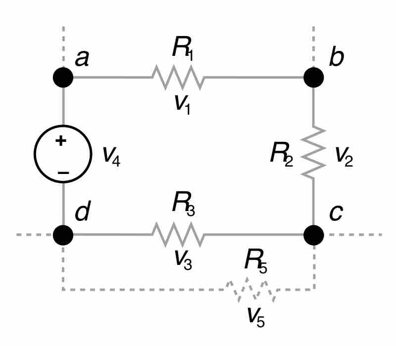 Here, Vk is the voltage across element k, and n is the total number of elements in the closed loop circuit. An illustration of such a circuit is shown in . In this example, the sum of v1, v2, v3, and v4 (and v5 if it is included), is zero.