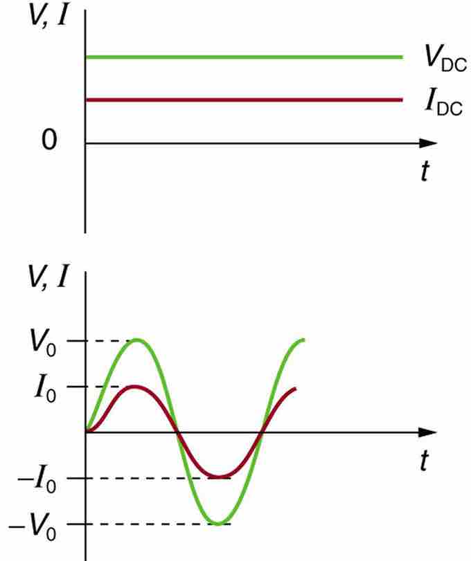 (a) DC voltage and current are constant in time, once the current is established. (b) A graph of voltage and current versus time for 60-Hz AC power. The voltage and current are sinusoidal and are in phase for a simple resistance circuit. The frequencies and peak voltages of AC sources differ greatly.