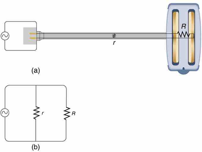 A short circuit is an undesired low-resistance path across a voltage source. (a) Worn insulation on the wires of a toaster allows them to come into contact with a low resistance r. Since P = V2/r, thermal power is created so rapidly that the cord melts or burns. (b) A schematic of the short circuit.