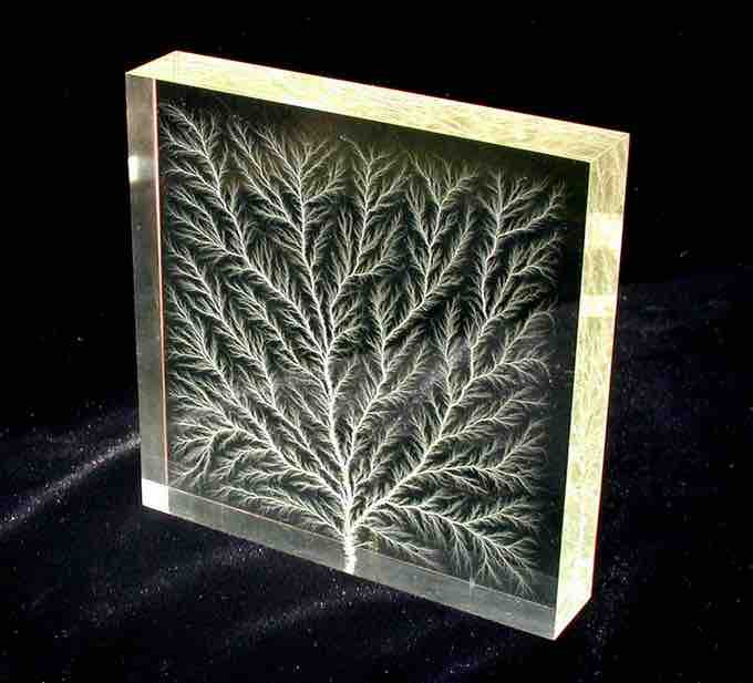 The treelike pattern in the plexiglas stems from the root of the breakdown. Current is dispersed in many different directions, creating different stems.