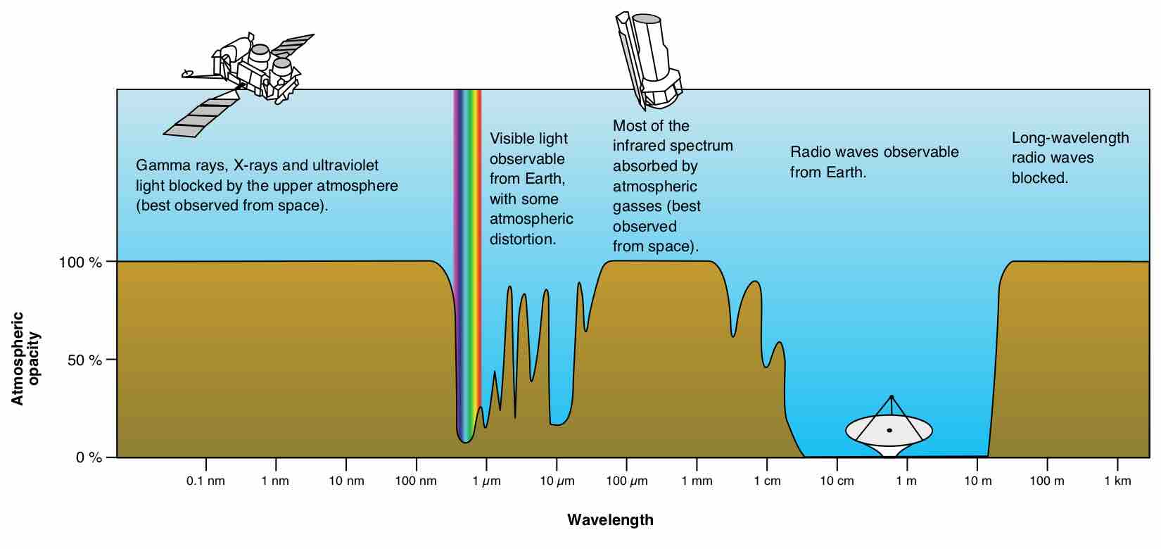This is a plot of Earth's atmospheric transmittance (or opacity) to various wavelengths of electromagnetic radiation. Most UV wavelengths are absorbed by oxygen and ozone in Earth's atmosphere. Observations of astronomical UV sources must be done from space.