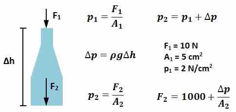 As an example, referring to , a downwards force of 10 N is applied to a bottle filled with a static liquid of constant density ρ at the spout of cross-sectional area of 5 cm2, yielding an applied pressure of 2 N/cm2. The cross-sectional area of the bottle changes with height so that at the bottom of the bottle the cross-sectional area is 500 cm2. As a result of Pascal's Law, the pressure change (pressure applied to the static liquid) is transmitted undiminished in the static liquid so that the applied pressure is 2 N/m2 at the bottom of the bottle as well. Furthermore, the hydrostatic pressure due to the difference in height of the liquid is given by Equation 1 and yields the total pressure at the bottom surface of the bottle. Since the cross-sectional area at the bottom of the bottle is 100 times larger than at the top, the force contributing to the pressure at the bottom of the bottle is 1000 N plus the force from the weight of the static fluid in the bottle. This example shows how, through Pascal's Principle, the force exerted by a static fluid in a closed system can be multiplied by changing the height and the surface area of contact.