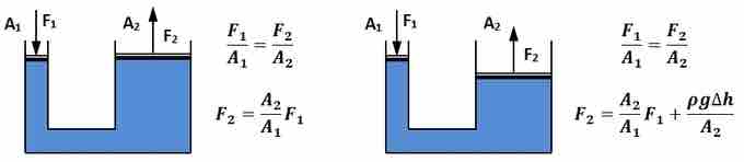 Two different types of hydraulic press configurations, the first in which there is no difference in height of the static liquid and the second in which there is a difference in height Δh of the static liquid.