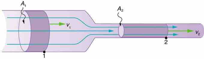 You can observe the continuity equation's effect in a garden hose. The water flows through the hose and when it reaches the narrower nozzle, the velocity of the water increases. Speed increases when cross-sectional area decreases, and speed decreases when cross-sectional area increases. This is a consequence of the continuity equation. If the flow Q is held constant, when the area A decreases, the velocity v must increase proportionally. For example, if the nozzle of the hose is half the area of the hose, the velocity must double to maintain the continuous flow.