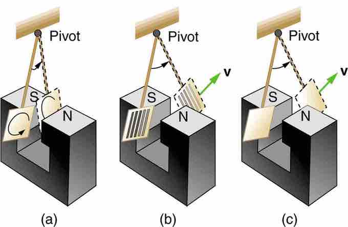 Consider the apparatus shown in , which swings a pendulum bob between the poles of a strong magnet. If the bob is metal, there is significant drag on the bob as it enters and leaves the field, quickly damping the motion. If, however, the bob is a slotted metal plate, as shown in (b), there is a much smaller effect due to the magnet. There is no discernible effect on a bob made of an insulator.