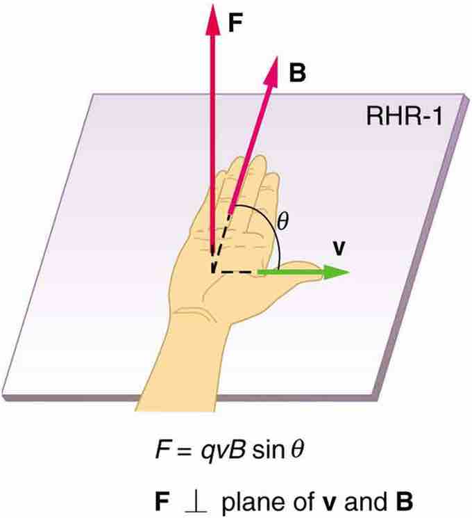 Magnetic fields exert forces on moving charges. This force is one of the most basic known. The direction of the magnetic force on a moving charge is perpendicular to the plane formed by v and B and follows right hand rule–1 (RHR-1) as shown. The magnitude of the force is proportional to q, v, B, and the sine of the angle between v and B.