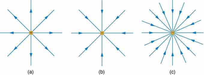 The electric field surrounding three different point charges: (a) A positive charge; (b) a negative charge of equal magnitude; (c) a larger negative charge.