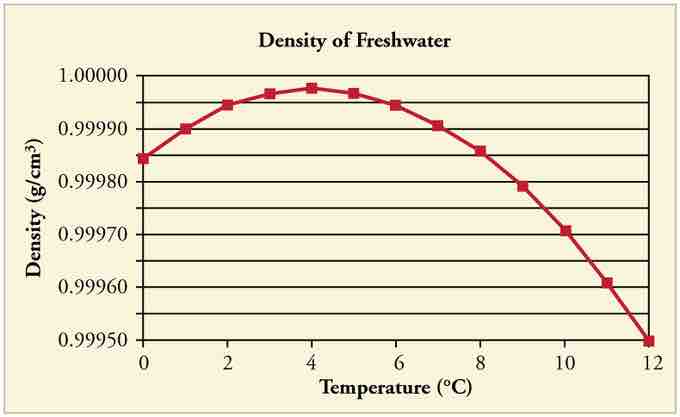 The density of water as a function of temperature. Note that the thermal expansion is actually very small. The maximum density at +4ºC is only 0.0075% greater than the density at 2ºC, and 0.012% greater than that at 0ºC.