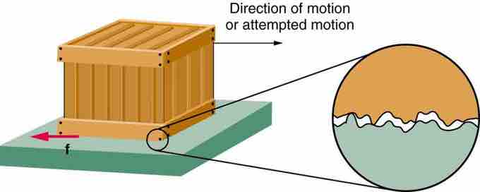 Frictional forces always oppose motion or attempted motion between objects in contact. Friction arises in part because of the roughness of the surfaces in contact, as seen in the expanded view. In order for the object to move, it must rise to where the peaks can skip along the bottom surface. Thus, a force is required just to set the object in motion. Some of the peaks will be broken off, also requiring a force to maintain motion. Much of the friction is actually due to attractive forces between molecules making up the two objects, so that even perfectly smooth surfaces are not friction-free. Such adhesive forces also depend on the substances the surfaces are made of, explaining, for example, why rubber-soled shoes slip less than those with leather soles.