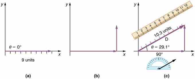 The head-to-tail method of vector addition requires that you lay out the first vector along a set of coordinate axes. Next, place the tail of the next vector on the head of the first one. Draw a new vector from the origin to the head of the last vector. This new vector is the sum of the original two.