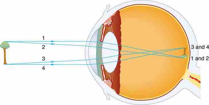The different parts of the eye have different refractive indexes, and this is what bends the rays to form an image. The cornea provides two-thirds of the power to the eye. The lens provides the remaining power. The image passes through several layers of the eye, but this happens in a way very similar to that of a convex lens. When the image finally reaches the retena, it is inverted, but the brain will correct this . For the vision to be clear, the image has to be formed directly on the retina. The focus needs to be changed, much like a camera, depending on the distance and size of the object. The eye's lens is flexible, and changes shape. This changes the focal length. The eye's ciliary muscles control the shape of the lens. When you focus on something, you squeeze or relax these muscles.